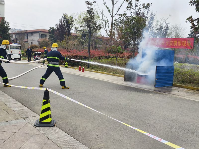 在应急救援演练环节,模拟了楼宇内强电井起火人员被困的场景和车棚电动车自燃着火的场景。物业团队迅速启动应急预案,组织人员疏散、急救,使用消防器材进行灭火,并与消防部门紧密配合,成功将火势控制并扑灭。演练过程中,大家严格按照应急预案进行操作,展现出了良好的应急反应能力和团队协作精神。