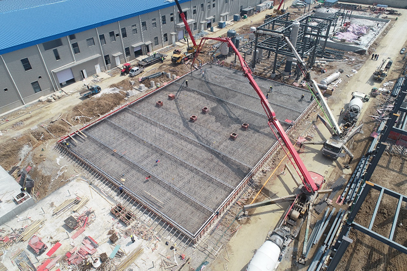 5月15日凌晨,历经21小时,随着最后一车混凝土通过天泵注入模板,中材锂膜三期项目气体回收区设备基础浇筑顺利完成,项目进度取得阶段性进展,标志着除独立的基膜车间一以外,已具备整套试生产设备安装条件。本次浇筑的气体回收区设备基础一次性浇筑体积2000余立方,相较于一般的筏板基础而言内部构造较为复杂,且有液体沟道